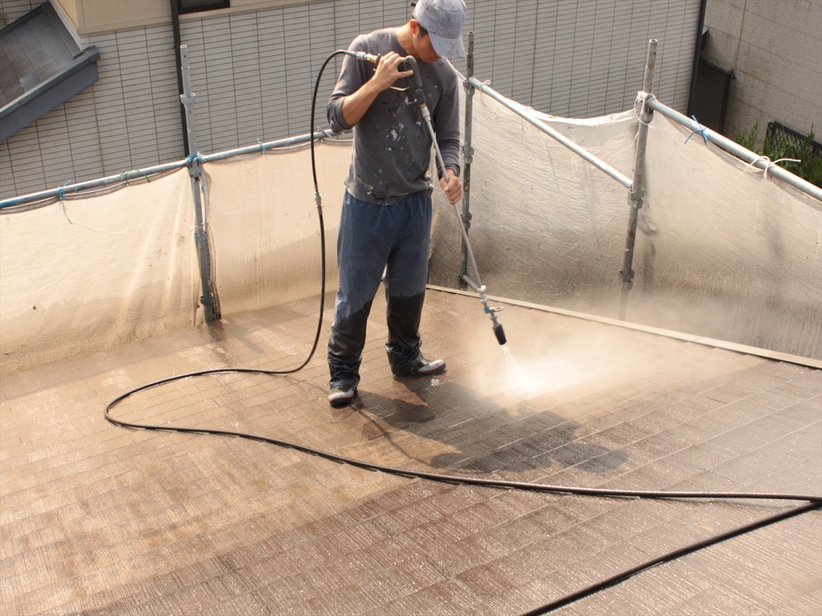 この後マスキング、クラック補修、下地塗装、屋根塗装となります。