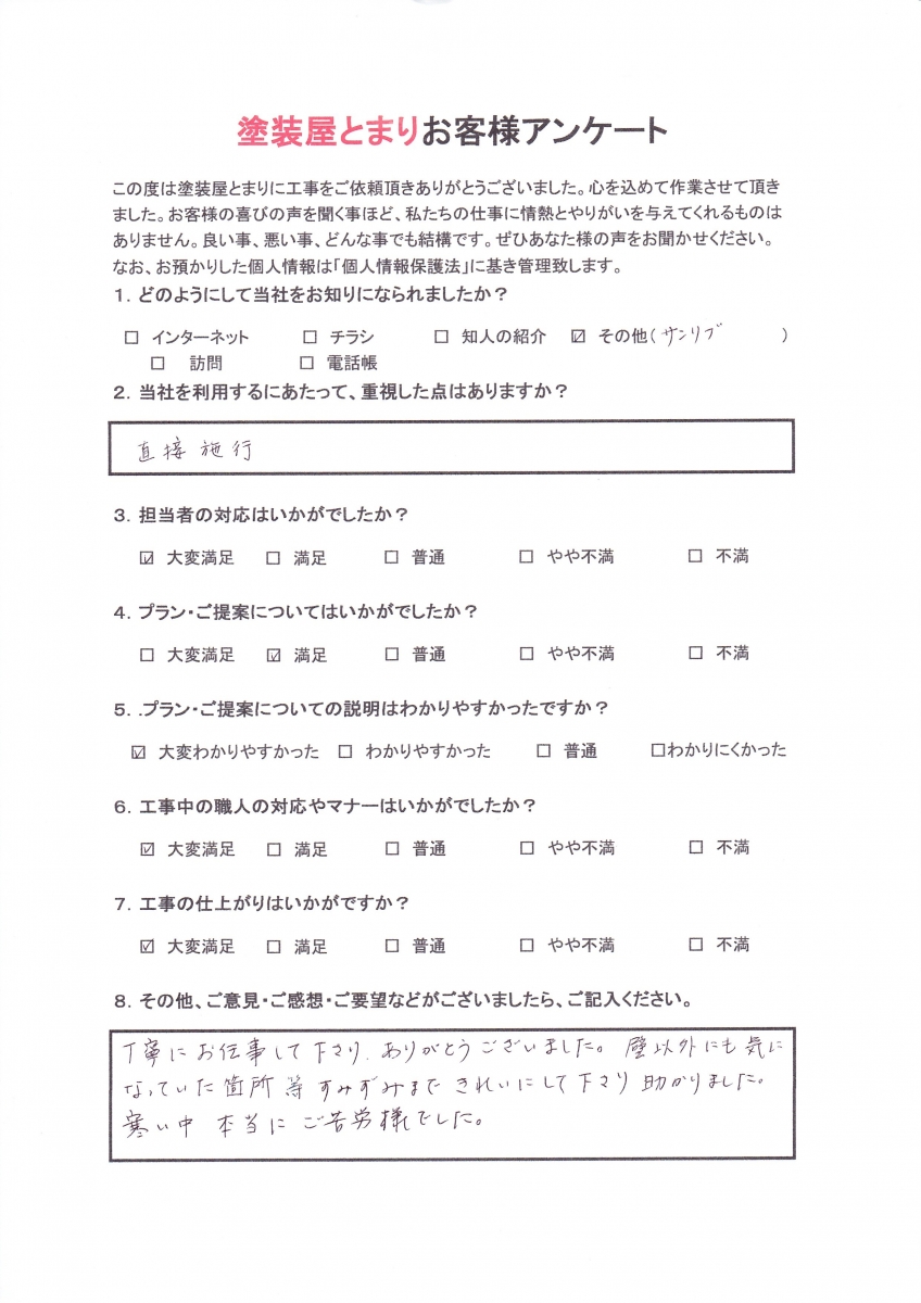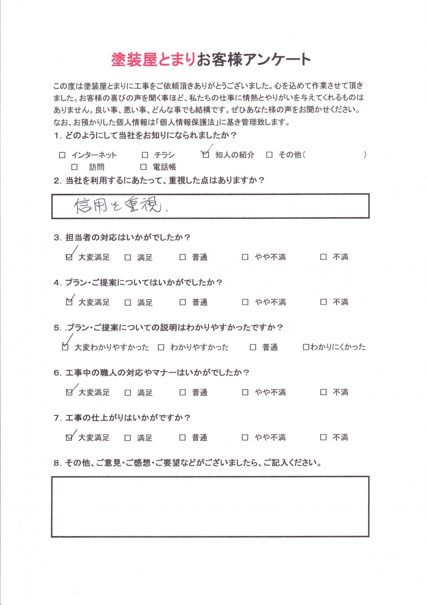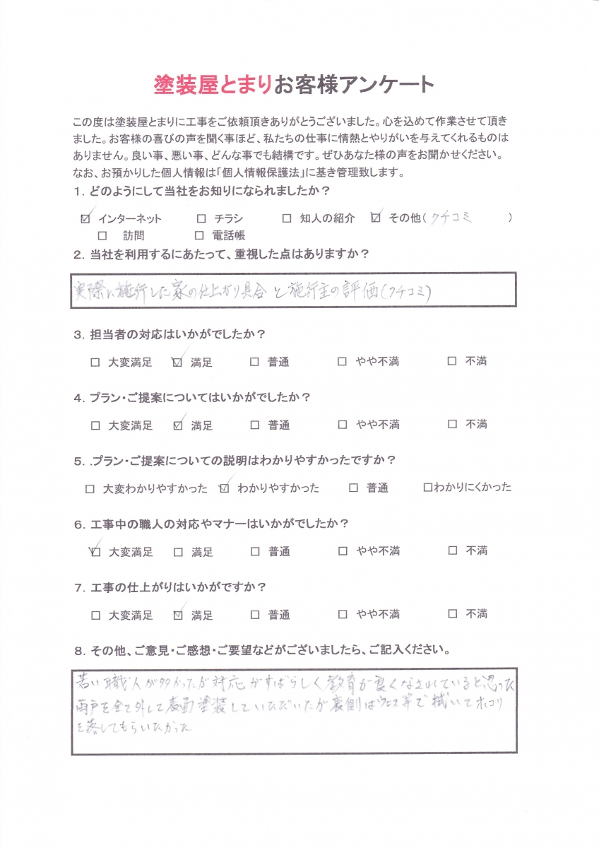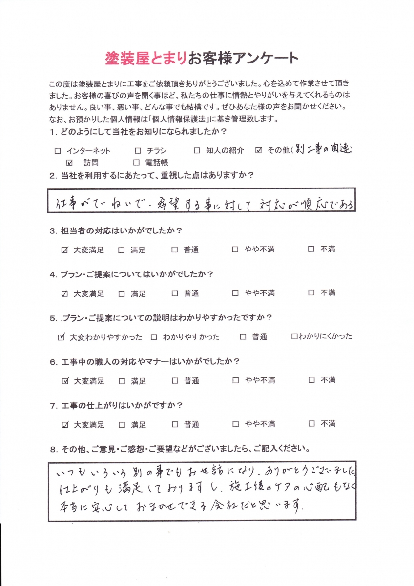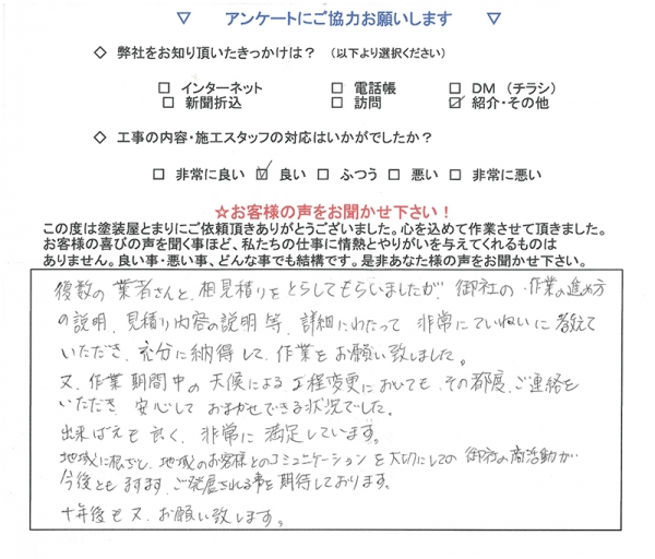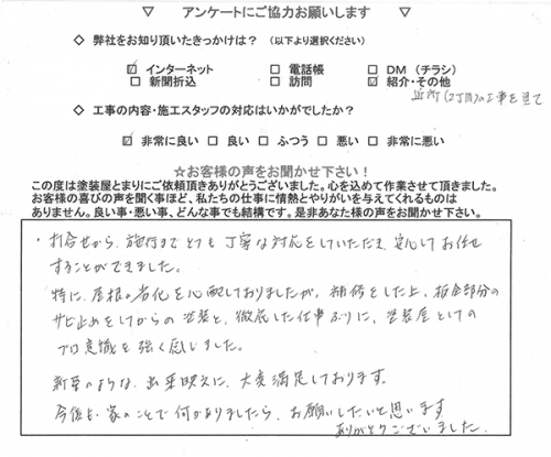 複数の業者さんと相見積をとらしてもらいましたが、御社の作業の進め方の説明、見積内容の説明等、詳細にわたって非常にていねいに教えていただき、十分に納得して作業をお願い致しました。
