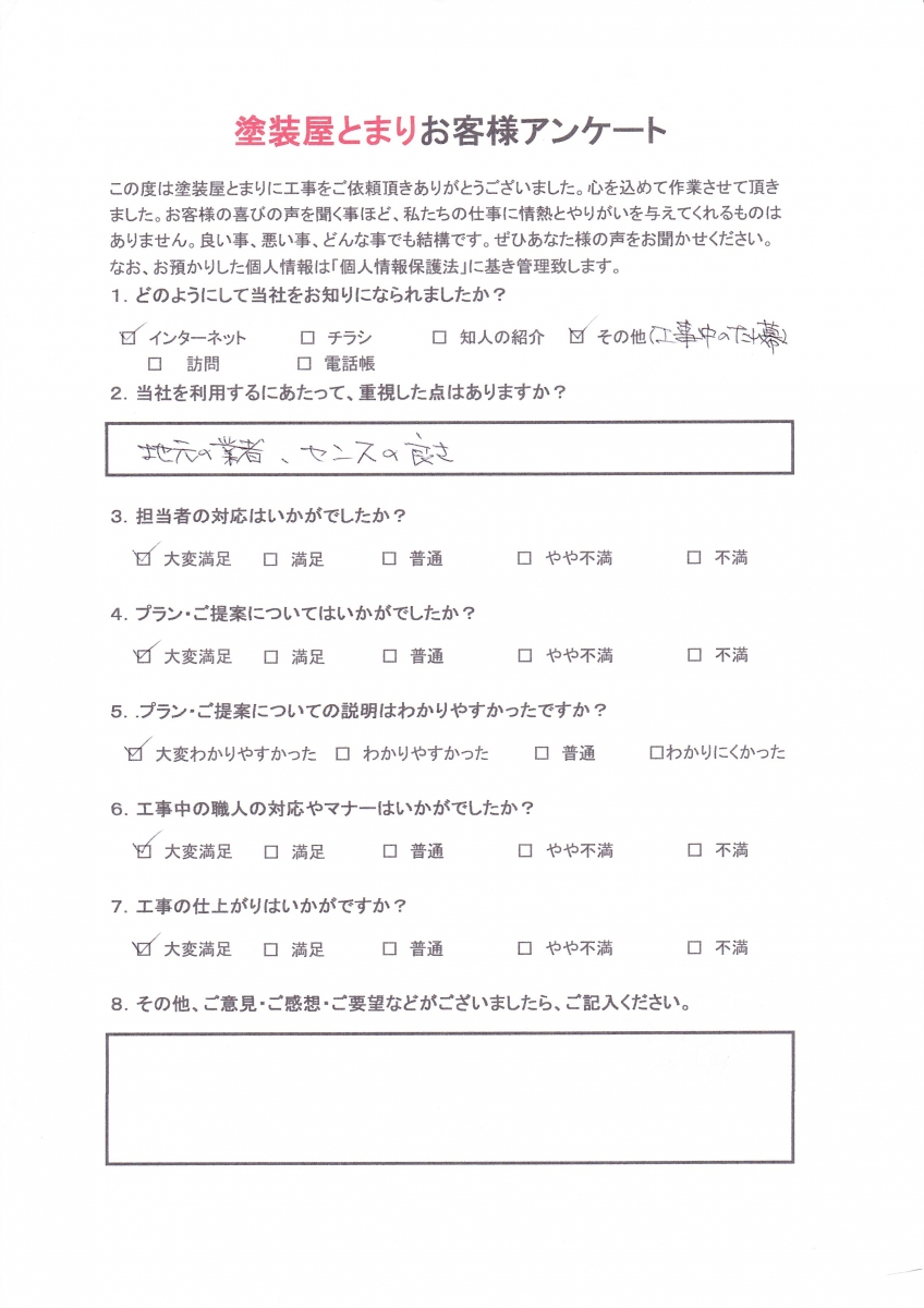 複数の業者さんと相見積をとらしてもらいましたが、御社の作業の進め方の説明、見積内容の説明等、詳細にわたって非常にていねいに教えていただき、十分に納得して作業をお願い致しました。